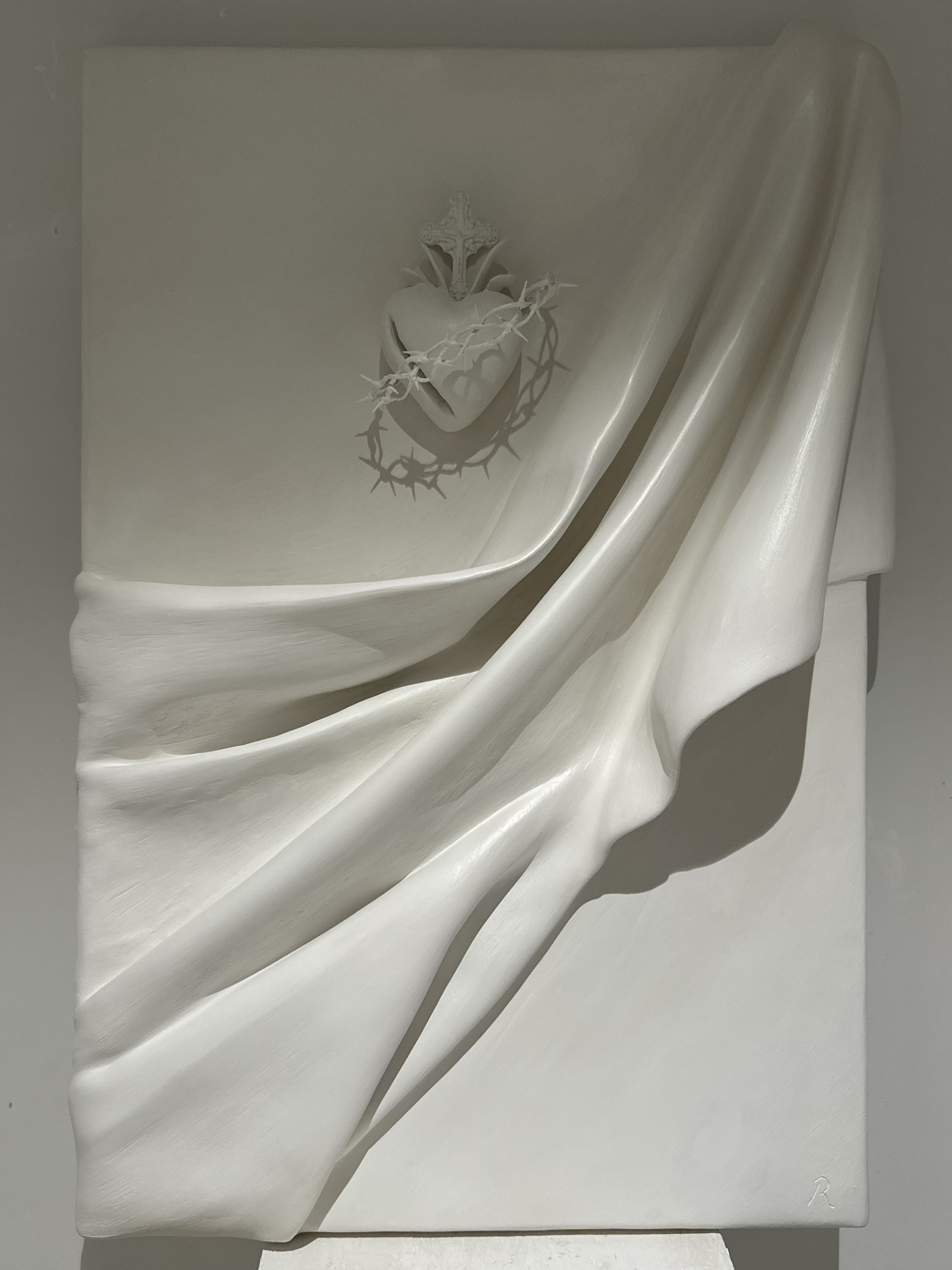 “The Sacred Heart’ is created entirely in plaster, each element shaped and carved by hand in prayerful reflection of the Sacred Heart of Jesus. The drapery symbolises the garment of Christ resting across His shoulder, a reminder of His humility and sacrifice. In the midst of His Garment, the Sacred Heart of Jesus is revealed, crowned with thorns, radiating both His suffering and infinite love that is poured out for us. ” — Rochelle, StudioR