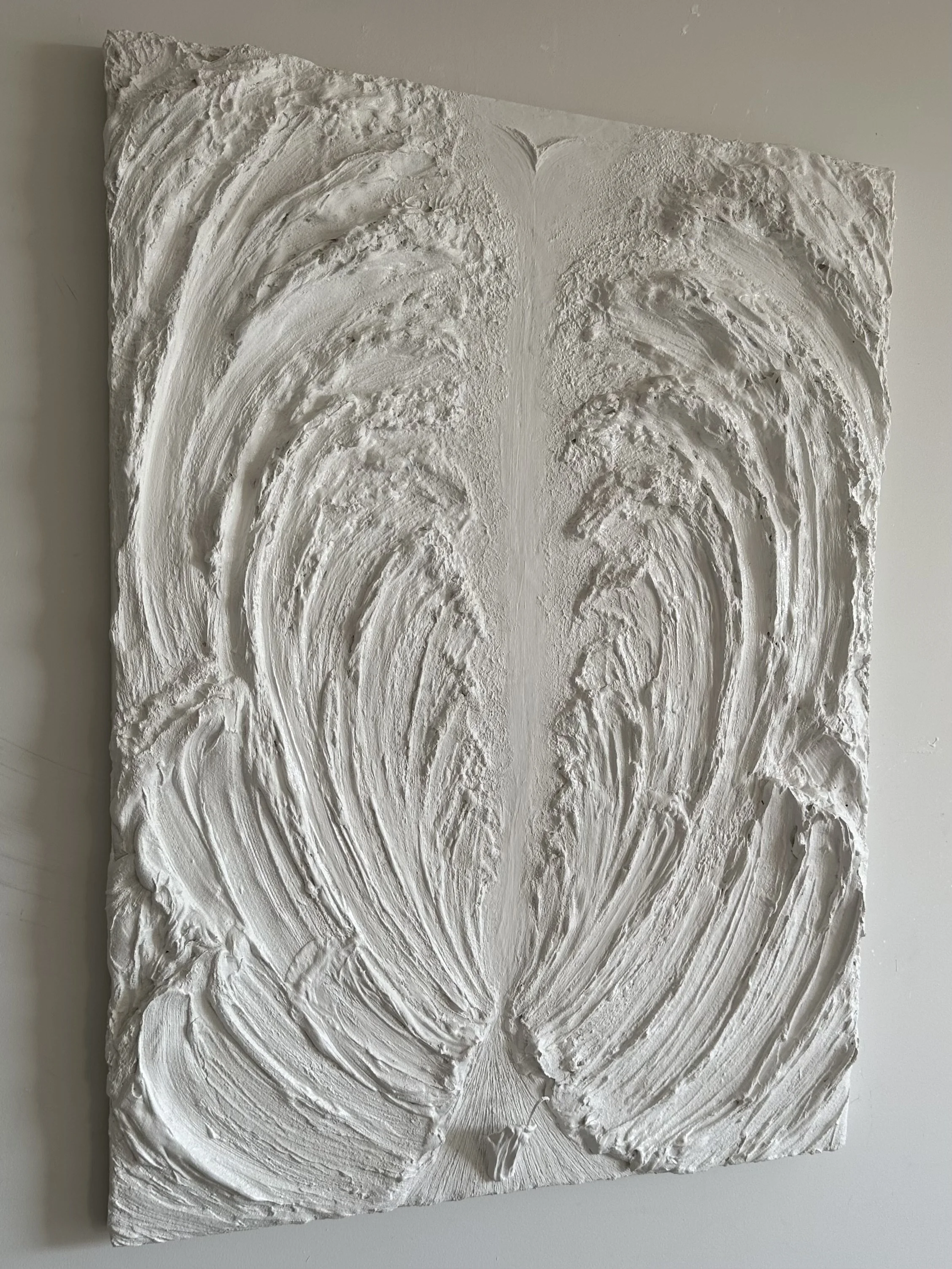“This work is a meditation on the parting of the Red Sea, a moment where fear met faith and the impossible opened at God’s command. The sweeping plaster textures echo the violent beauty of divided waters, suspended between chaos and deliverance and at the centre, a narrow passage emerges, a sacred threshold carved by divine authority. The roughness speaks of turmoil as the still vertical axis embodies unwavering presence. Through the white texture, I honour both judgment and mercy, destruction and salvation as it is a remembrance that when the path seems consumed by waves, God makes a way — not around the waters, but through them.”